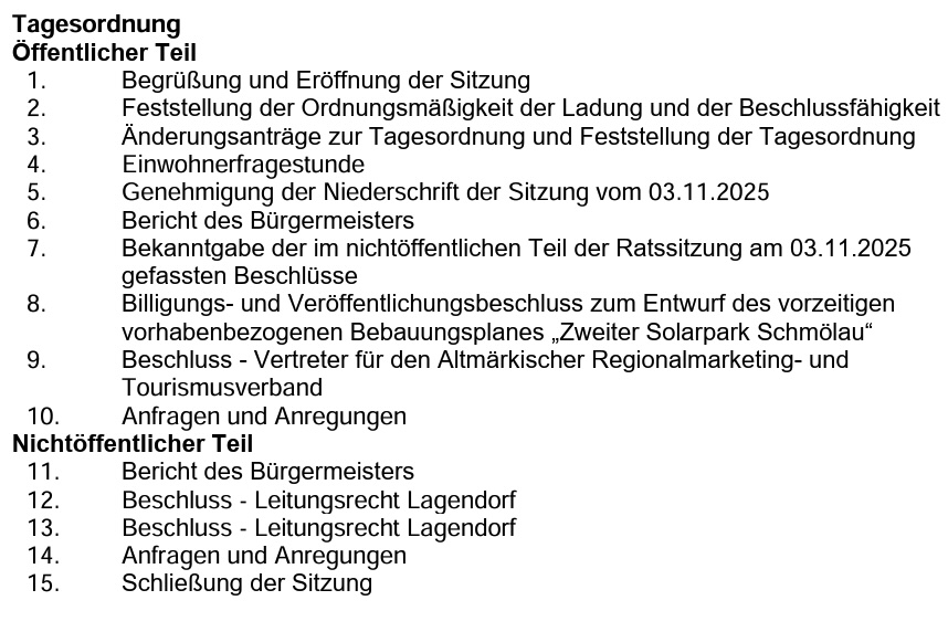 Die Tagesordnung ist ebenfalls als PDF-Datei auf der Homepage der Verbandsgemeinde Beetzendorf-Diesdorf zu finden. Neben der Tagesordnung sind alle Beschlussvorlagen einsehbar.